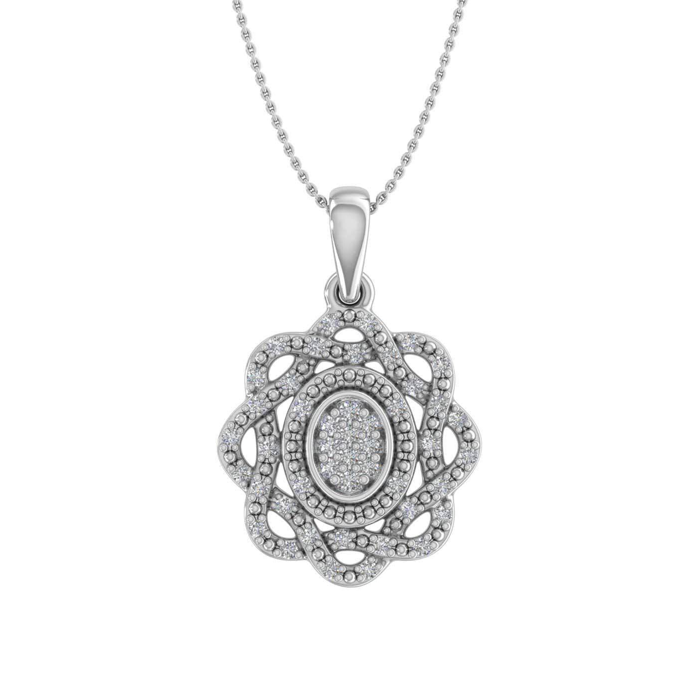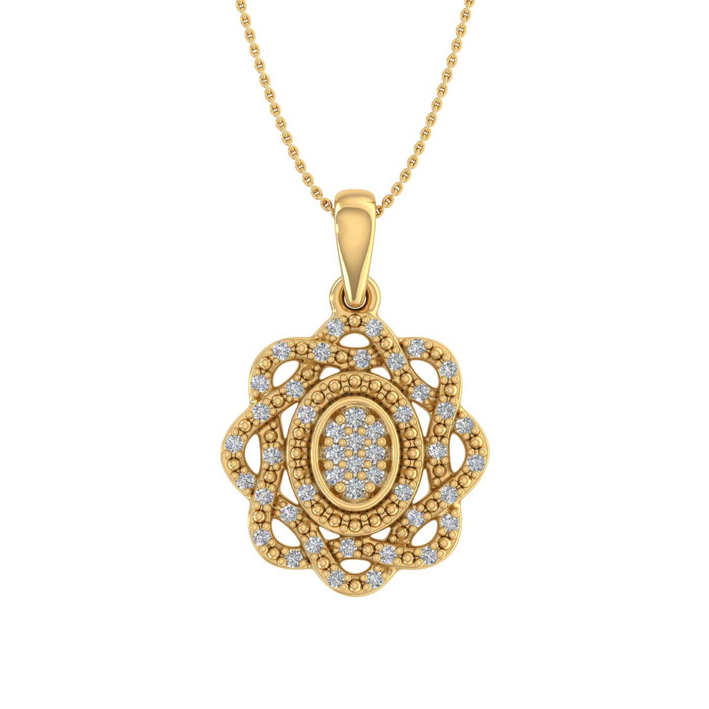This flower-shaped pendant necklace is beautifully made in lustrous 14K gold with 46 IGI Certified prong-set sparkling icy white diamonds of 0.15 carat weight. The beautiful design and craftsmanship makes this diamond pendant dangle charmingly over a silver chain with a very stylish look.