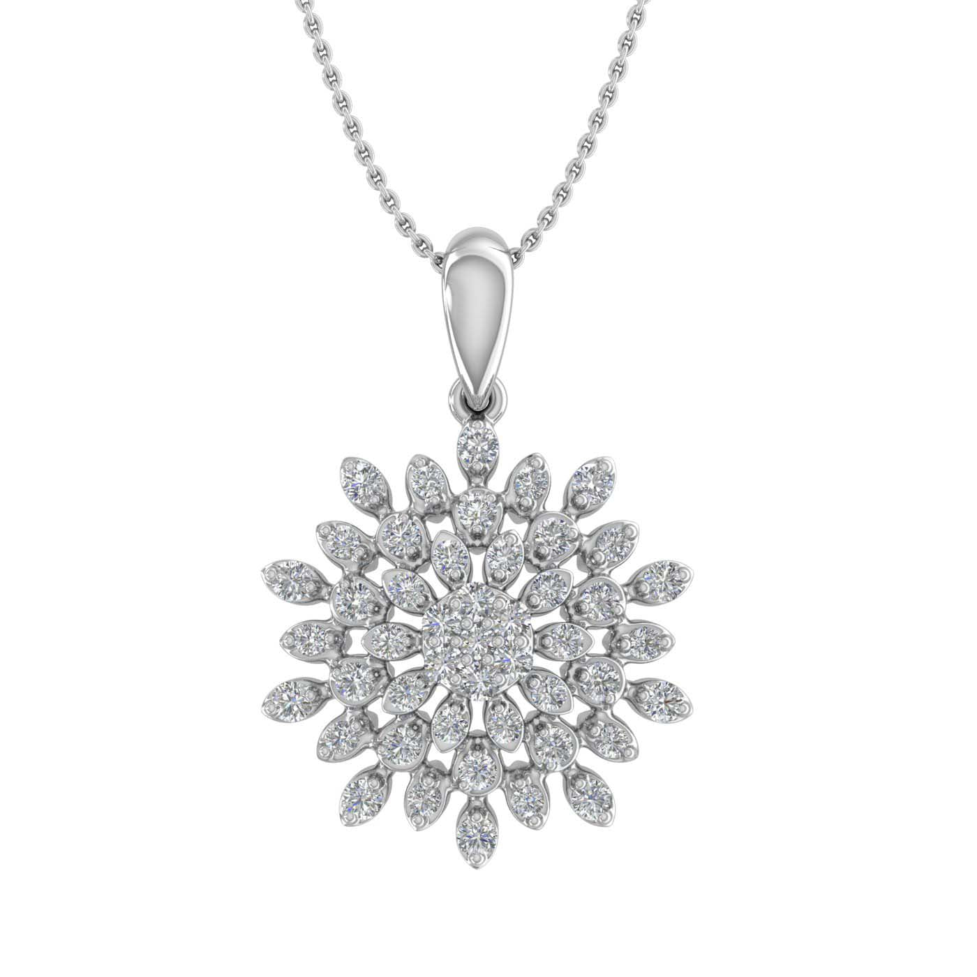 This flower-shaped pendant necklace is beautifully made in lustrous 14K gold with 46 IGI Certified prong-set sparkling icy white diamonds of 0.15 carat weight. The beautiful design and craftsmanship makes this diamond pendant dangles charmingly over a silver chain with a very stylish look.