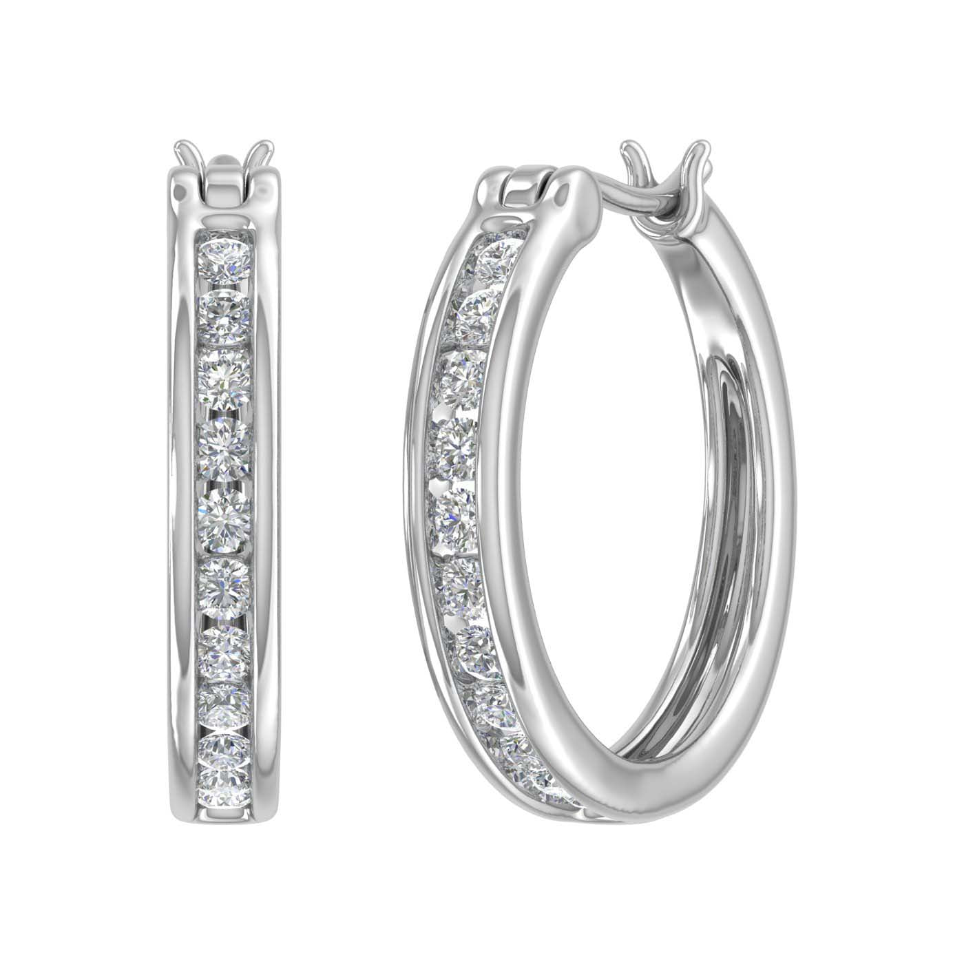 A symbol of elegance, this channel set hoop earrings feature with white diamonds of 1/2 carat weight. This pair of earrings is made in 14k gold, and it is an extremely comfortable piece of jewelry to be used for parties as well as daily wear.