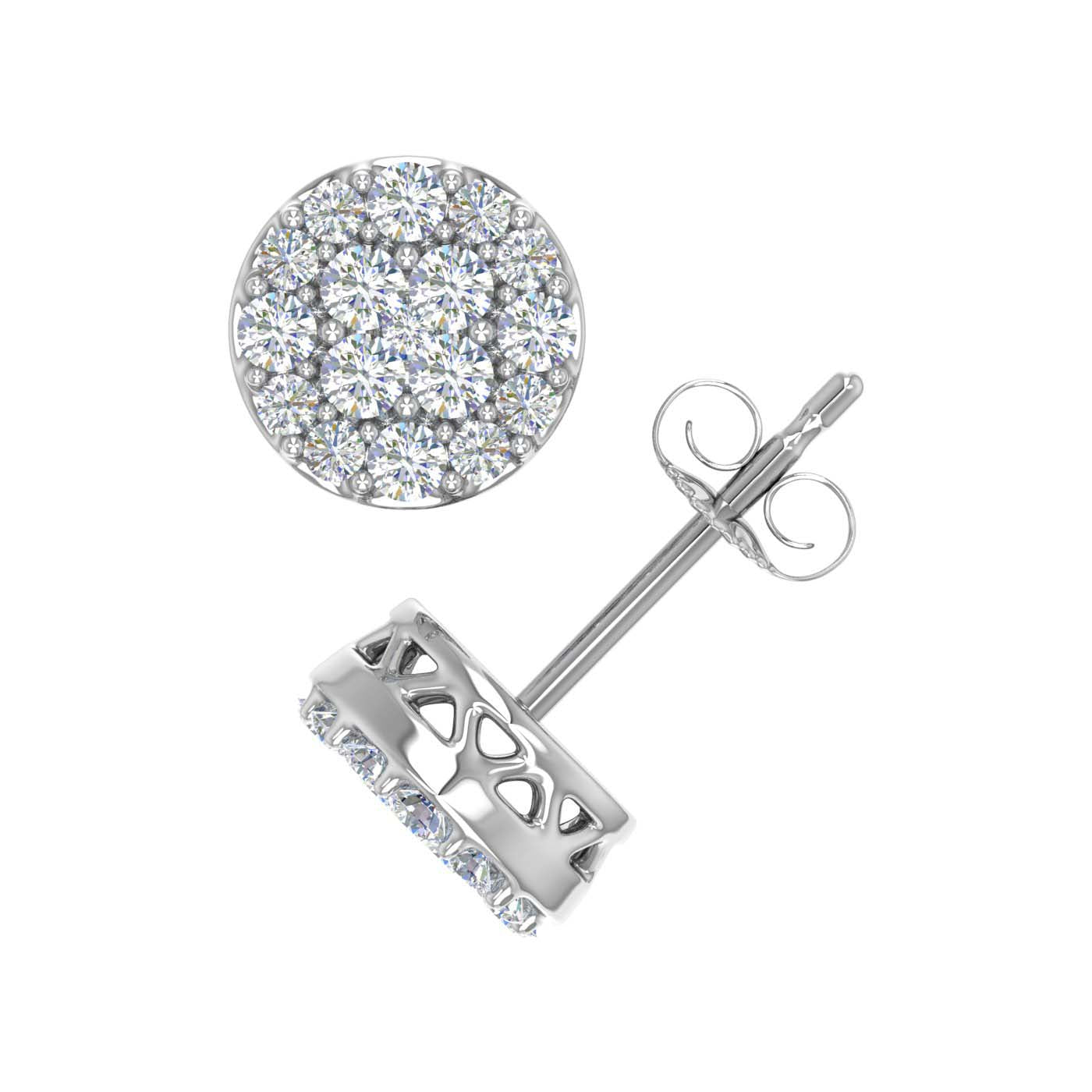 These prong set cluster stud earrings are a perfect example of the modern fashion trends. Beautifully rendered in 14K gold, It features with white diamonds of 1/2 carat weight. These earrings are one of the most gracious pieces of jewelry and come along an IGI Certificate for authenticity.