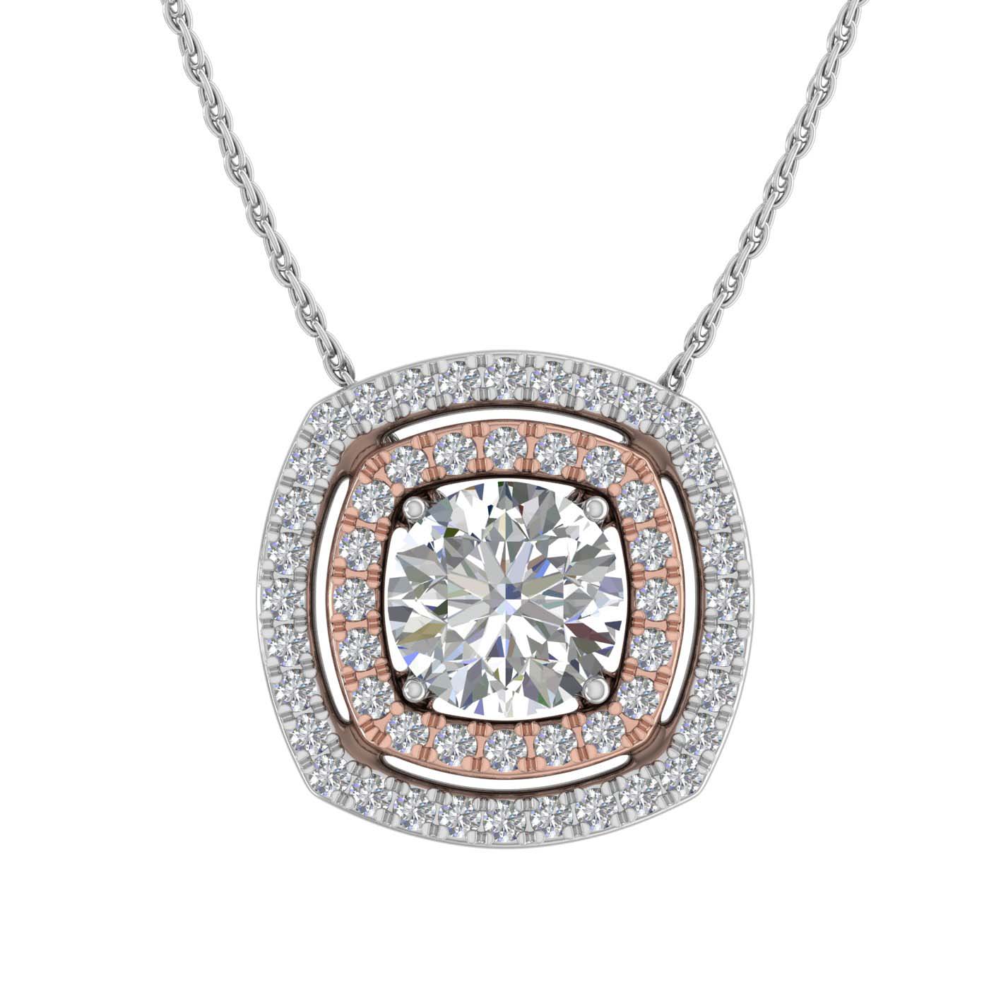 1/2 Carat Diamond Cushion Shaped Halo Pendant Necklace in White Gold & Rose Gold