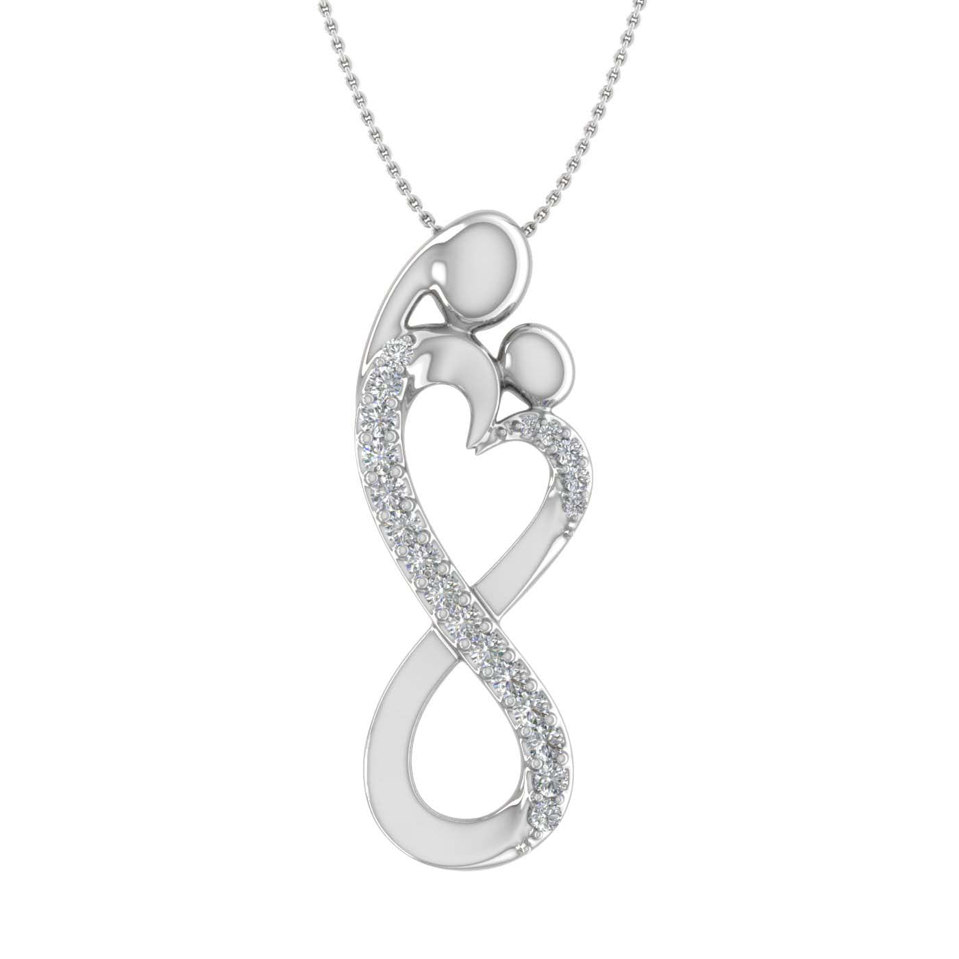 This beautiful Mother Child pendant necklace symbolize the impeccable bond between a mother and daughter. Forged in 14k gold this pendant features 20 IGI Certified white diamonds of 1/4 carat weight secured with prong setting. Nothing can be better than this pendant to express your love for your mother. The pendant dangles along a beautiful silver chain.