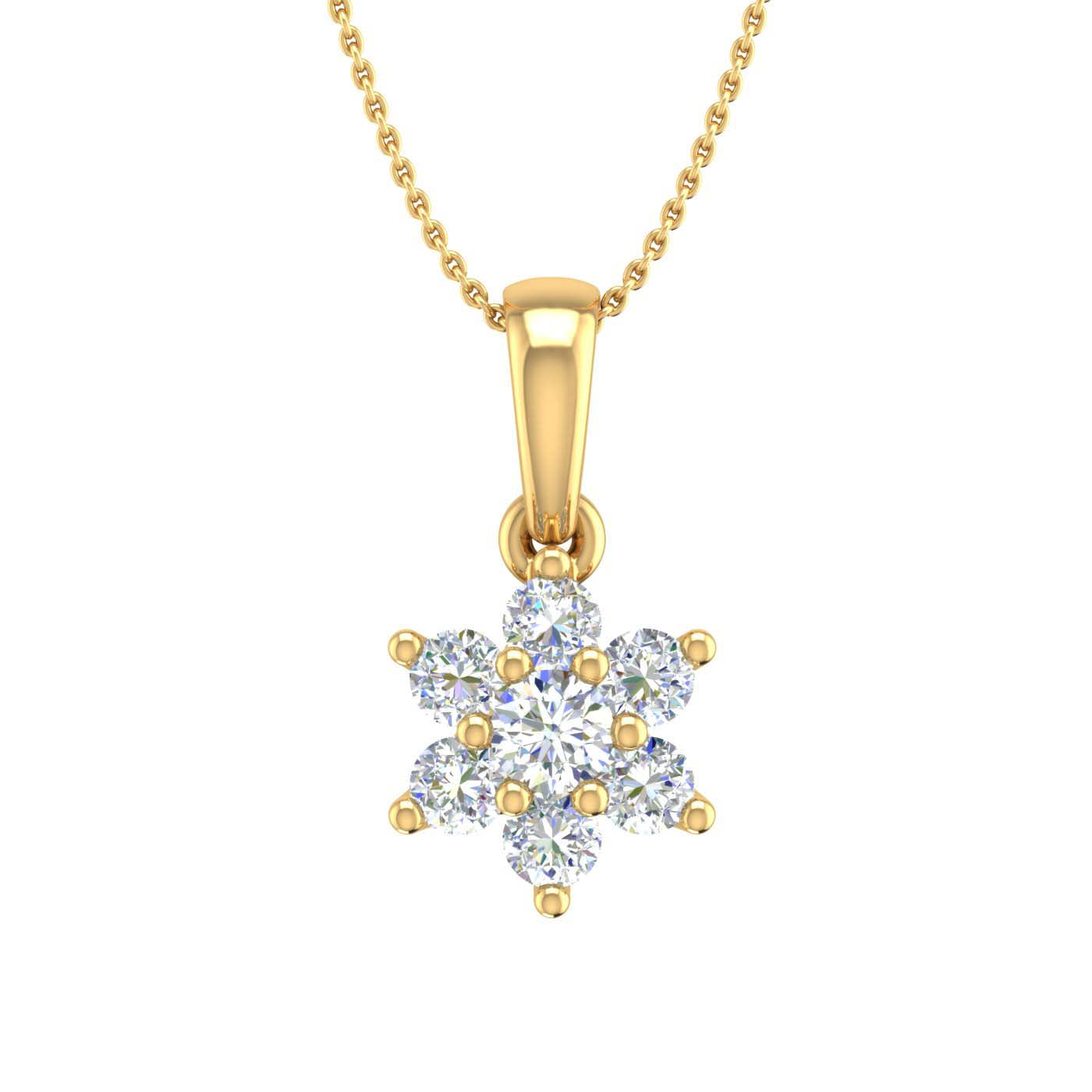 This glamorous and stunning diamond 7-stone floral cluster pendant necklace is beautifully made in lustrous 14K gold and embedded with sparkling icy white diamonds of 1/5 carat weight. The beautiful design and craftsmanship of the pendant makes it look alluring and captivating. It comes with a silver chain.