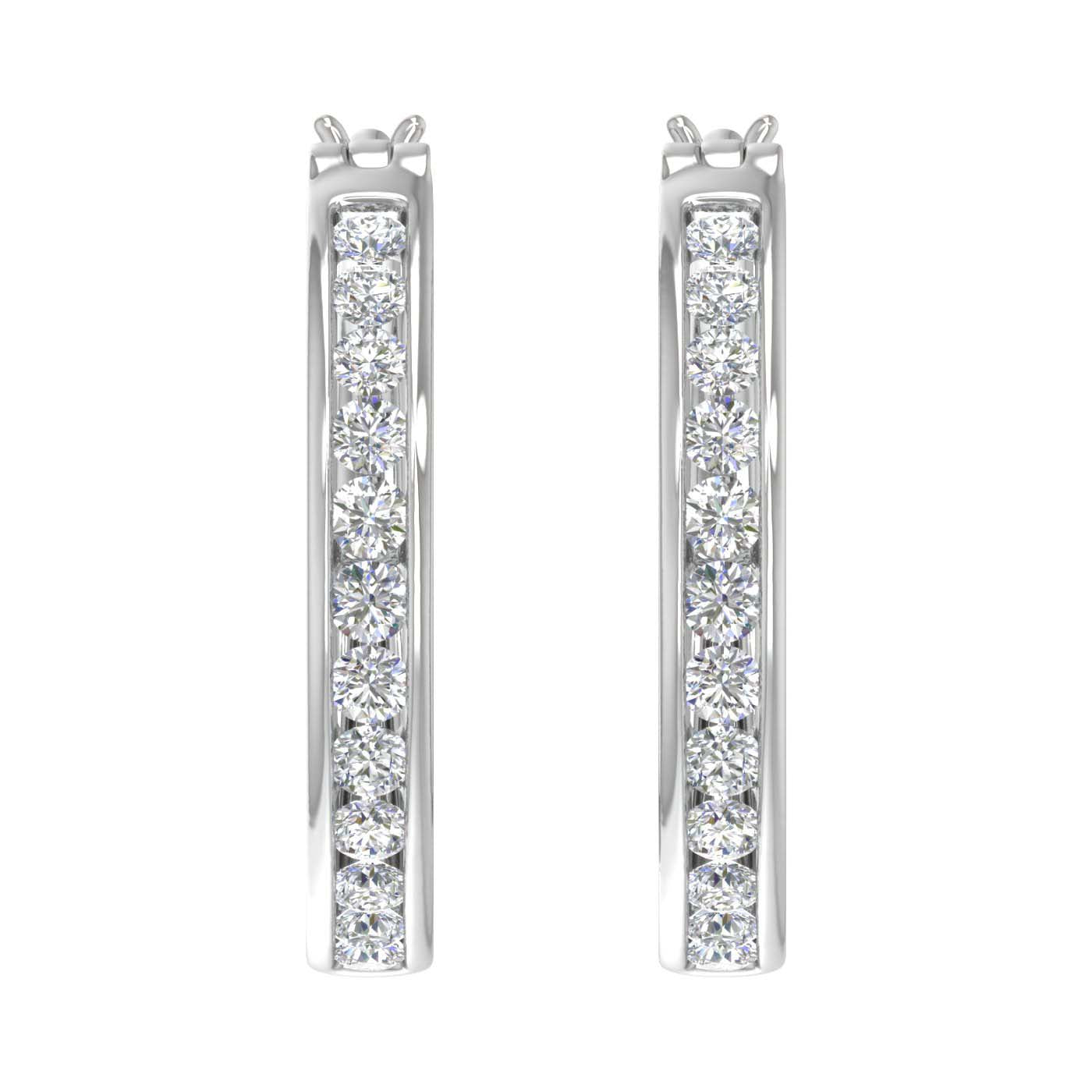 A pair of subtle 14k gold channel set diamond hoop earrings is the most used piece of jewelry for daily wear. It features sparkling white round diamonds of 1 carat weight, and comes with an IGI certificate for authenticity.