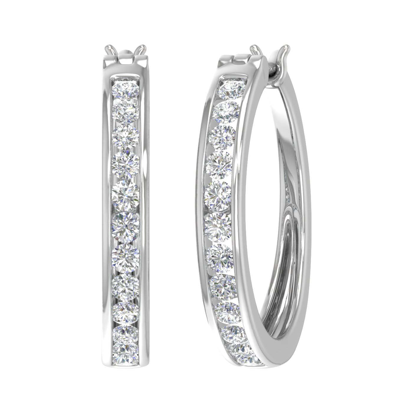 A pair of subtle 14k gold channel set diamond hoop earrings is the most used piece of jewelry for daily wear. It features sparkling white round diamonds of 1 carat weight, and comes with an IGI certificate for authenticity.