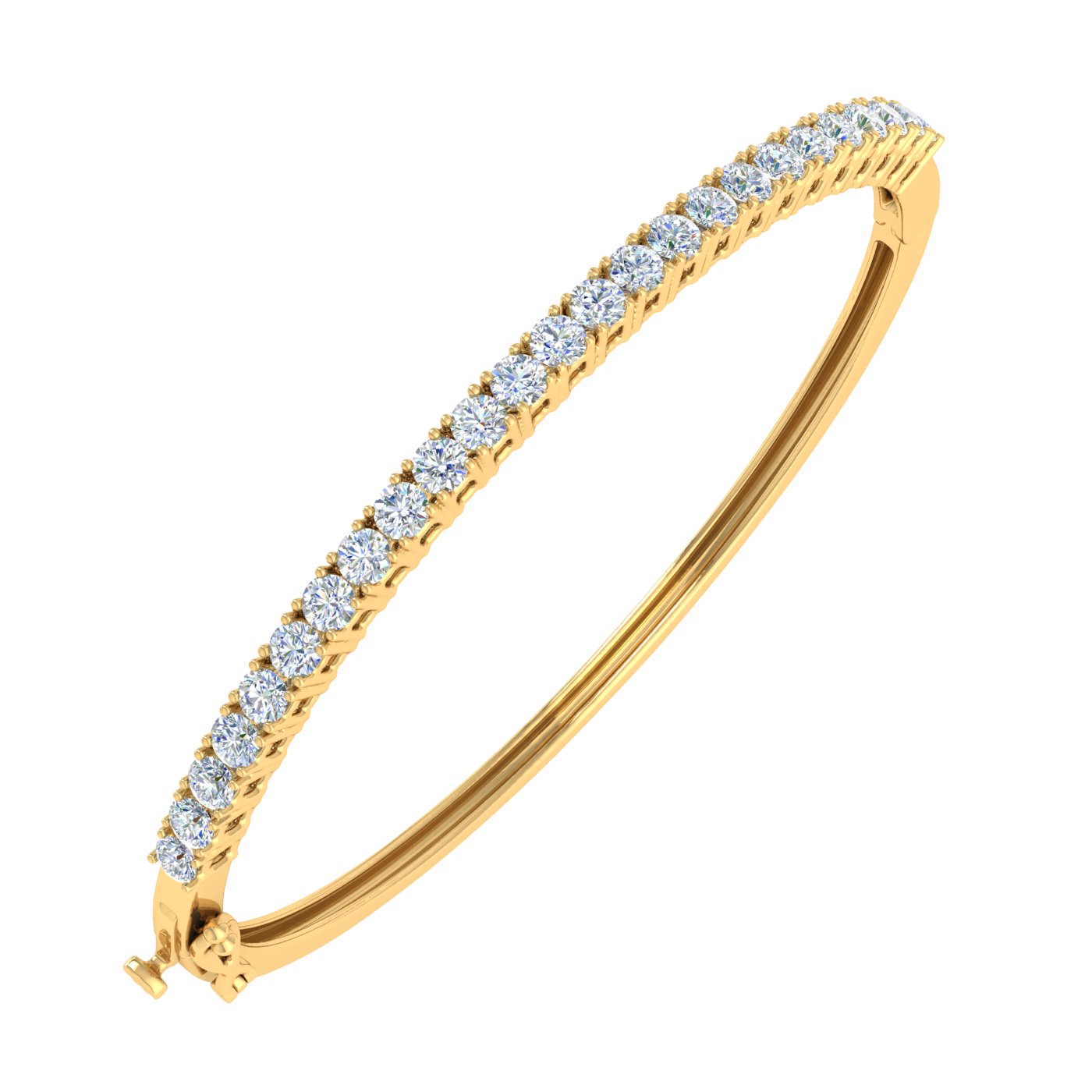 Get ready to be mesmerized with this stunning prong set diamond bangle bracelet which contains diamonds of 2 carat weight. Made of 14K gold, the sparkling diamonds, give it a flawless shine making it look irressitable.